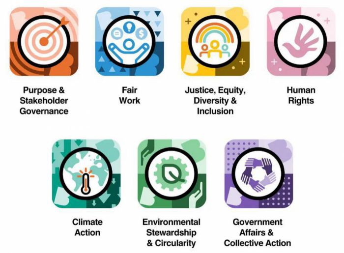 B Corps müssen Leistungsstandards in sieben IMPACT TOPICS erfüllen: