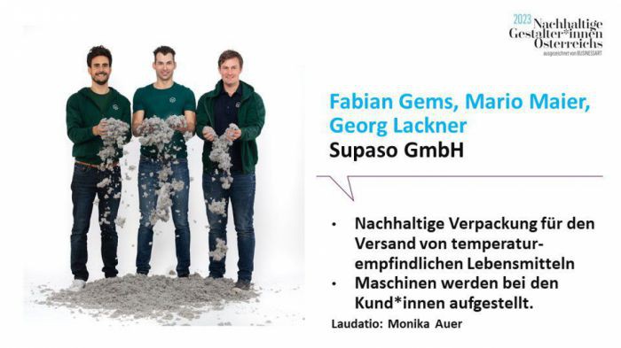 Supaso hat eine nachhaltige Verpackung für den Versand von temperaturempfindlichen Lebensmitteln wie Obst, Gemüse, Fisch, Fleisch, Joghurt oder Milch entwickelt: Ein Überkarton ist mit einem Einlagesystem auf Basis von Zellulosefaser aus 100 Prozent Altpapier gedämmt. Er kann nach Gebrauch im Ganzen ins Altpapier gegeben werden. Durch die spezielle Konstruktion kann die transportierte Ware mehr als 48 Stunden kühl gehalten werden. Das ist besser als mit einer Styroporbox.