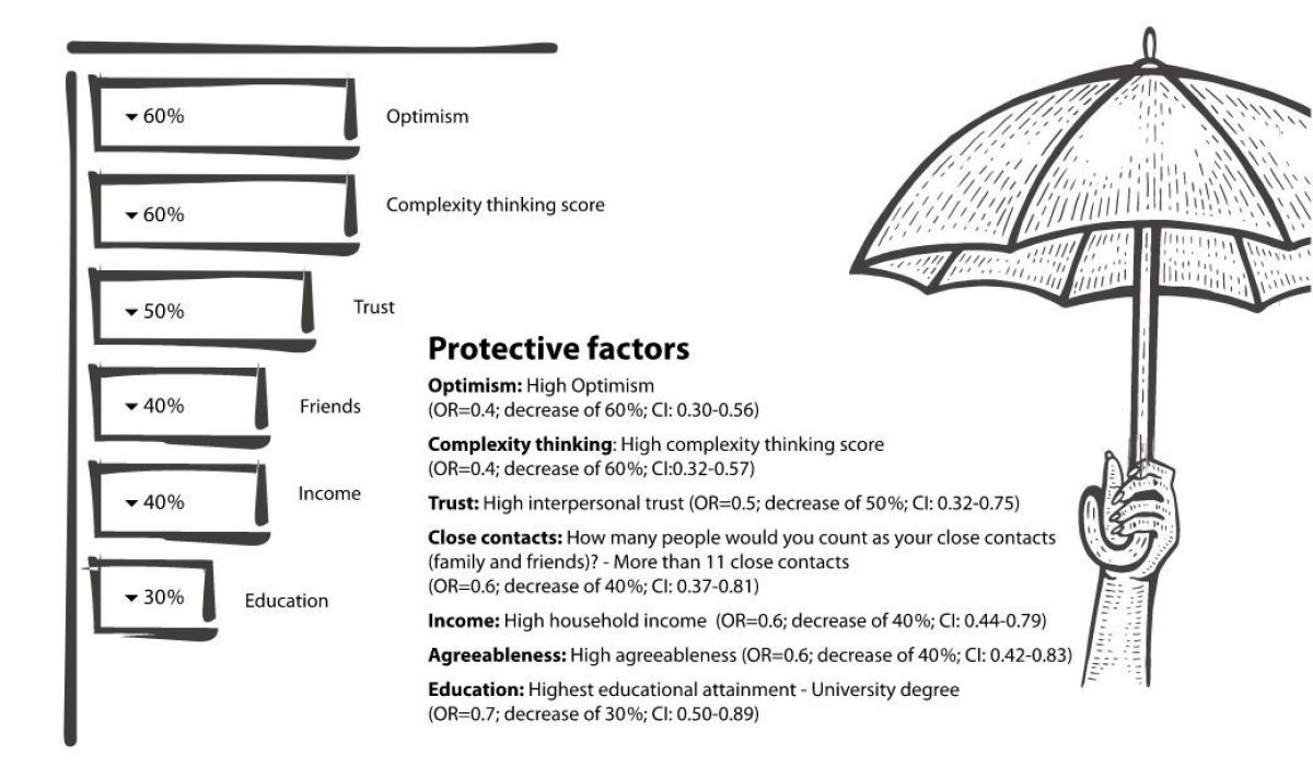 Bei Teilnehmer*innen mit Studienabschluss war es um 33 Prozent unwahrscheinlicher, dass sie einen hohen Wert bei Verschwörungsglauben aufwiesen, als bei Menschen mit Mittelschulausbildung. Dies zeigte sich nur bei Männern, nicht bei Frauen; und auch nur in Österreich und der Schweiz, nicht aber in Deutschland. Hohe Werte bei Vertrauen, Optimismus und Komplexitätsdenken gingen ebenso einher mit niedrigen Werten bei Verschwörungsglauben. Das Vorhandensein von mehr engen Kontaktpersonen scheint bei den Befragten ebenso mit einem geringeren Verschwörungsglaubenswert zu korrelieren.